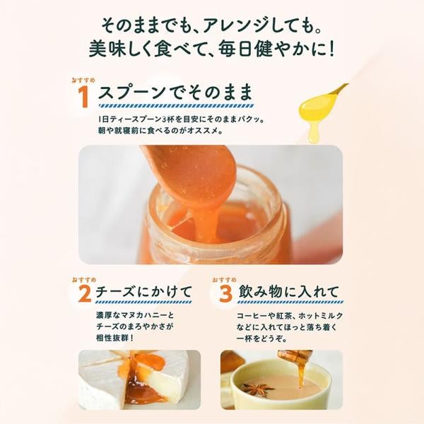 *Honey may crystallize. It can be enjoyed as is, but if you wish to return it to a liquid state, avoid direct heat and gently warm it in a water bath at around 40°C with the lid open.
