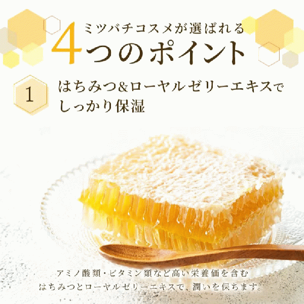 Honey and Royal Jelly extract, which contain high nutritional value such as amino acids and vitamins, help maintain moisture.