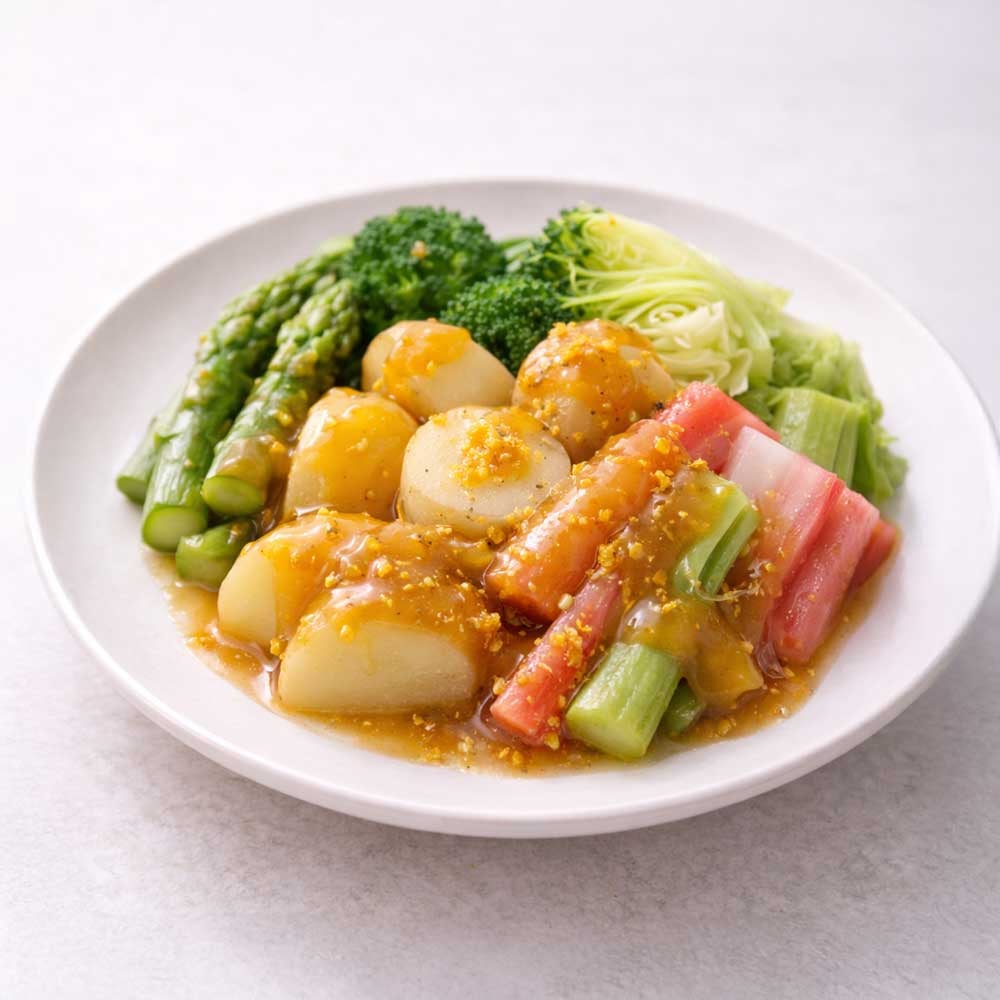 Seasonal vegetables with butter sauce, Manuka Honey miso sauce