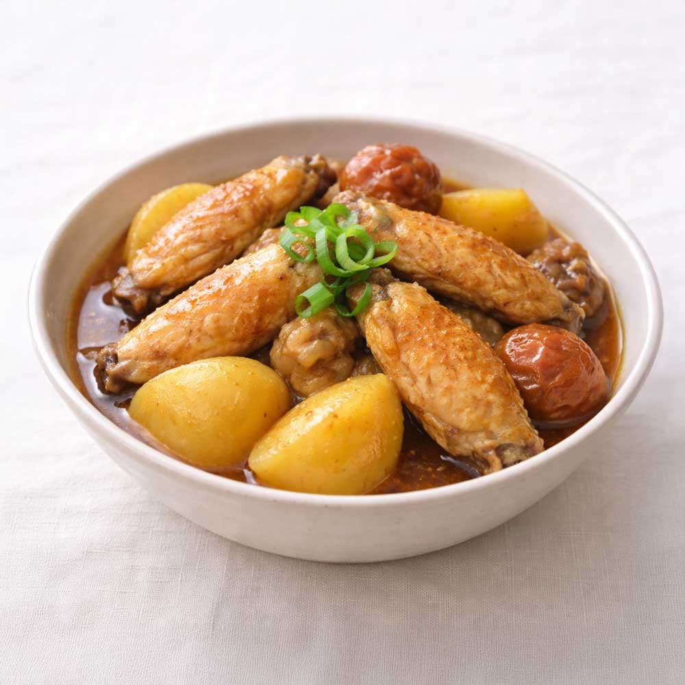 Simmered chicken wings and potatoes with plum