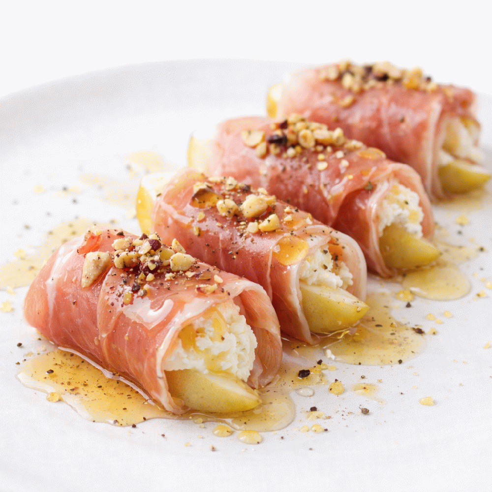 Prosciutto-wrapped pear (or peach) with mascarpone drizzled with honey