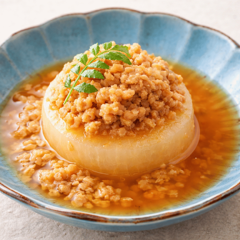Steamed radish with honey and minced chicken in a thick sauce