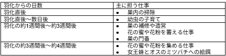 働き蜂の仕事内容を羽化からの日数ごとにまとめると、以下の通りです。