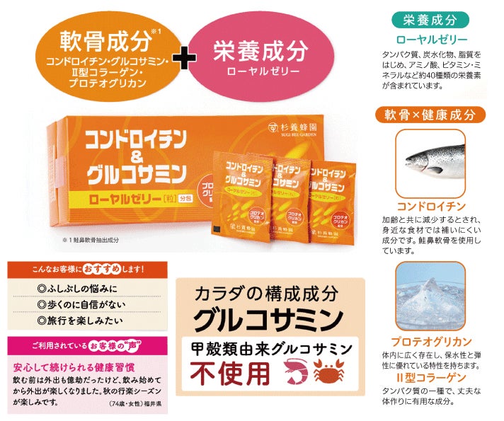コンドロイチンとグルコサミンに厳選した生ローヤルゼリーの凍結乾燥粉末を加え、飲みやすくした栄養補助食品です。